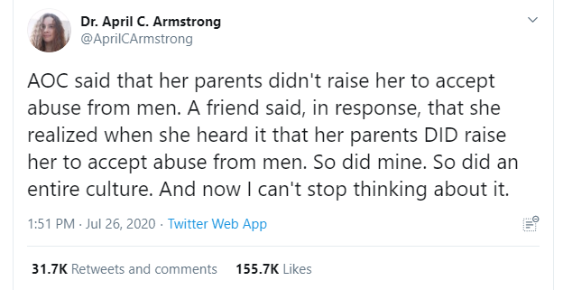 It’s easy to dismiss what someone says if you don’t particularly like that person. Alexandria Ocasio-Cortez is a polarizing character. However that speech she gave resounded with women across all aisles. And no one echoed my thoughts about what she said more than Dr. April C. Armstrong in this tweet.